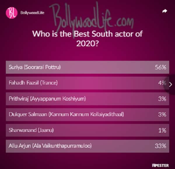 Last year was full of surprises and shocks. We lost a lot of gems from our entertainment industry, while the OTT platform boomed like never before. A lot of films released on the OTT platform, thus ensuring that the masses are still entertained while sitting at home, trying to beat the pandemic. So, as our year-ender for 2020, BollywoodLife.com had conducted a few polls, asking you to choose the best from the best. And today, we are declaring the results of one such poll that we conducted. The poll for Best South Actor of 2020. The Best South Actor of 2020 is none other than dashing Suriya for his portrayal of Maara in Soorarai Pottru. He beat Allu Arjun by a considerable margin.