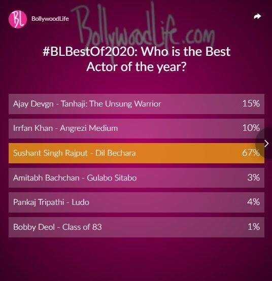 The actor has won the poll by a huge margin as he garnered 67% of the votes, which surely shows how SSR's last performance struck a chord with the audience and made them emotional. After Sushant, Ajay Devgn received 15% votes for his performance in Tanhaji: The Unsung Warrior, followed by late Irrfan Khan with 10% for Angrezi Medium. On the other hand, Amitabh Bachchan, Bobby Deol and Pankaj Tripathi received votes in single digits despite delivvering superb acts in Gulabo Sitabo, Class of 83 and Ludo.