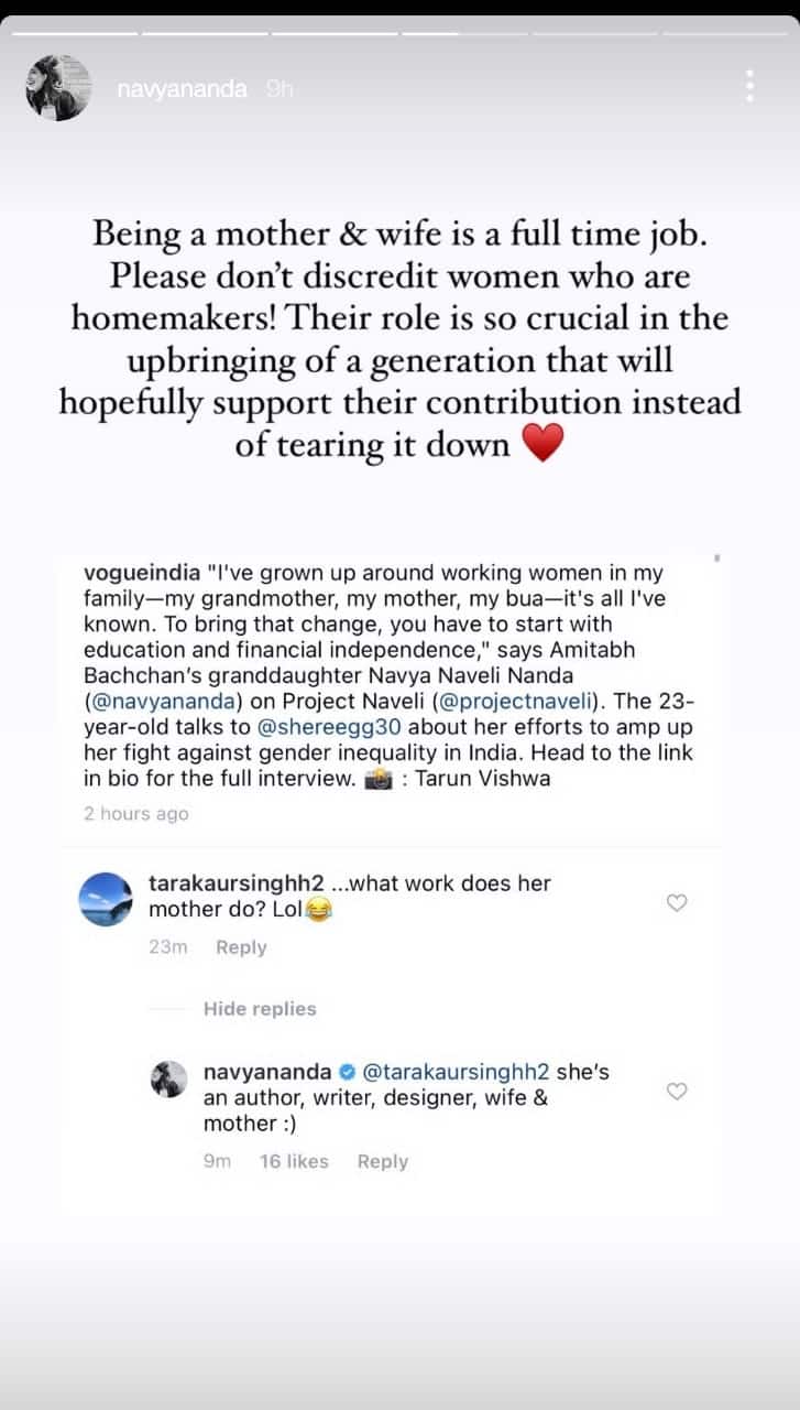"She's an author, writer, designer, wife and mother," responded Amitabh Bachchan's granddaughter, sticking up for her mumma, after which she wrote on Instagram: "Being a mother and a wife is a full-time job. Please don't discredit women who are homemakers. Their role is so crucial in the upbringing of a generation that will hopefully support their contribution instead of tearing it down." Check out her post below: