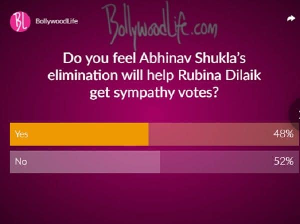 In one of the recent episodes of Bigg Boss 14, we saw a solid twist when Abhinav Shukla got evicted as many supporters of other contestants voted him out. While his elimination shocked the fans and other TV celebs, we saw Rubina Dilaik breaking down after Bigg Boss announcing her husband Abhinav's exit from the show. The duo supported each other in the show and that was their biggest advantage as they entered as the couple. Since audience had an emotional connection with the duo, we had conducted a poll asking whether Abhinav's exit will help the Shakti actress get sympathy votes. The results are out and it shows that the audience only believes in individual's game as 52 per cent said that Abhinav Shukla's elimination will not help Rubina getting sympathy votes. Well, looking at the poll result, it looks that fans believe in fair competition.