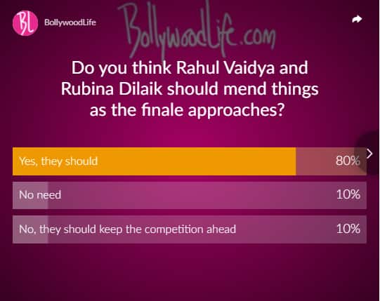 Rubina and Rahul share a warm moment with one another. They even dance together. The RJ who made Rahul sing calls it the best moment on the show so far. Hence we had asked fans if they feel that Rahul Vaidya and Rubina Dilaik should mend things as the finale approaches and fans feel they should. 80% of fans feel they should sort out their differences and mend things. The rest 20% feel they should not do so.