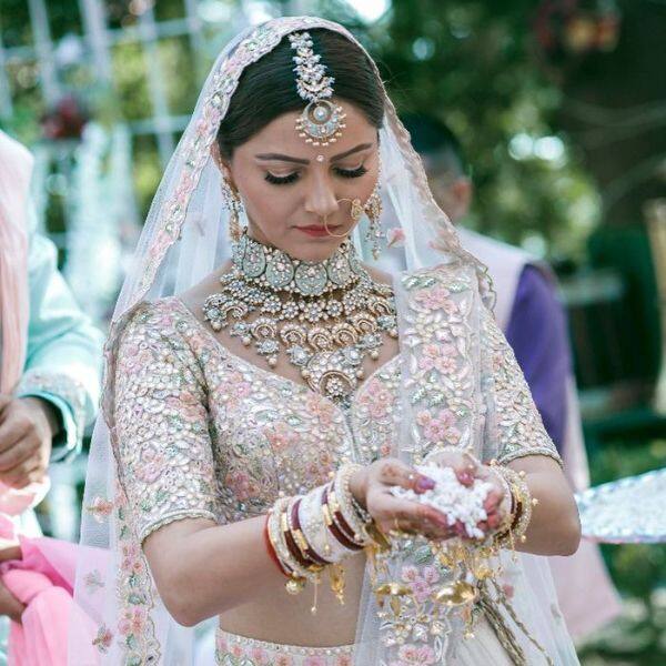 Singer Neha Kakkar got married to Rohanpreet Singh and wore pale pink lehenga along with bandhgala necklace, maang tika and heavy earrings.